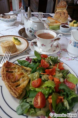 店の名前は「ビーズ・ヴィンテージ・ティールーム」。ティールームと書いてありましたが、オールデイダイニングの店で、朝食、ランチ、アフタヌーンティー、クリームティー、ハイティーなど、時間帯や好みでメニューを選べるようになっています。どの時間にも利用できるのは、時間が限られている旅行者には魅力的ですね。1940年代の雰囲気を再現したインテリアもおしゃれでステキでした。私たちはランチ時に訪れたので、プラウマンズ・ランチとキッシュと野菜サラダをオーダー。デザートは、大好きなヴィクトリア・スポンジとどちらにするか悩んだ末、フルーツケーキをチョイスしました。ランチメニューも手作りケーキもとても美味しかったので、次回はアフタヌーンティーを試してみたいと思っています。