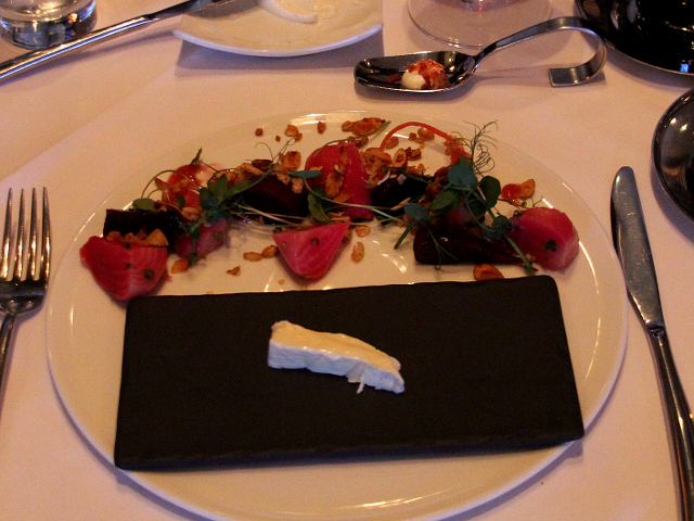 お料理は4品のティスティングのコースとラムのサドル、ビーガンのためのパスタ・ディナーを注文します。こちらのお店の厨房で使っている野菜はほとんど地元メリーランド州と隣接するペンシルベニア州の農場から、他の食材も厳選された北米の産地から直送された最高の食材だそうです。ビーツがメインのお料理を食べたことはあまりありませんでしたが、この巨大なビーツは大根のお仲間のはずなのに、このお料理は甘くて心なしかお芋のような食感でびっくり!