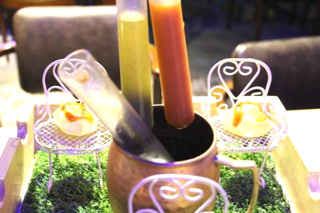 謎めいた煙に包まれて登場した試験管の中には、2種類のソース。パニ・プーリ(Pani Poori)と呼ばれるさっくりとした皮の中に、タマリンドの甘酸っぱいソース、そして緑のジャルジーラ(jaljeera)と呼ばれるクミンとミントの香りのジュースを入れて、こぼれないように口に運ぶと、さっくりとした皮とジュースのすがすがしさが楽しめます。