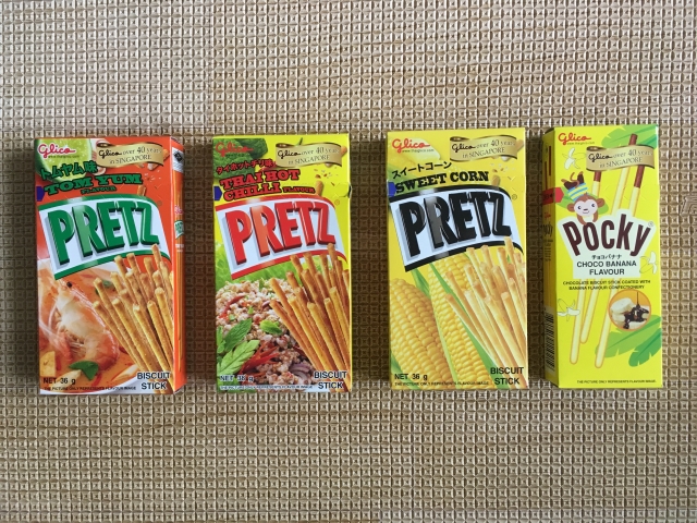 グリコ「プリッツ」も、トムヤムクン味やタイホットチリ味、そしてスイートコーン風味、「ポッキー」もチョコバナナ味など、日本ではあまり見かけない種類があるので、筆者もばらまき土産でよく使っています。トムヤムクン味などはタイでも売っているそうですが、シンガポールで売っているものの箱には「Glico over 40 years in Singapore」と記載されているので、シンガポールのお土産としても胸を張れそうです。各種S$1ドル程度でお財布にもやさしいお土産候補です。