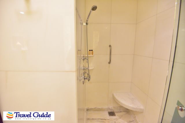 バスルームは、大理石の重厚な造りで、洗面台を中心に左にシャワーブース、右にバスタブがあります。