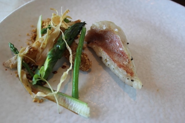 ヨーロッパの漁業会社と契約し、その時獲れた一番良い魚を送ってもらっているという、本日の鮮魚。この日はフランスからやってきたメバルの仲間、ローズ・フィッシュでした。それを、薄くスライスして乾燥させたパースニップ、グリーンアスパラガスを、醤油を加えた甘辛いソースと合わせています。散りばめられたヘーゼルナッツのクランブルがとても香ばしく、程よくしっかりと火が通ったローズ・フィッシュの味とよく合います。