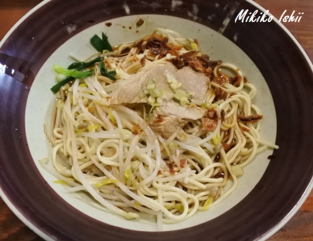 スープ有りと同じトッピングで、しょうゆベースのたれを絡めて食べる汁無しの玉里麺。個人的に甘辛いタレがしっかりと麺に絡む汁無しタイプが好みでした。