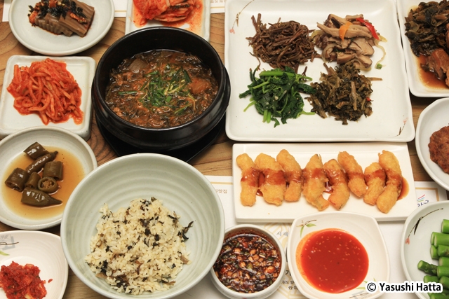楊口のパンチボウル村では名産のシレギを買って持ち帰れるようにもなっていますし、2012年にはシレギ専門の飲食店「シレウォン」もオープン。1人前1万ウォン(約1040円)というリーズナブルな価格で、バリエーションに富んだシレギ定食を味わえます。写真はもっともポピュラーな調理法のひとつで、右下にあるのがシレギのナムル。柔らかく煮戻してからゴマ油で炒めて作る香ばしい風味の一品です。この日はワラビ、ハナウド、シイタケのナムルと一緒に盛り合わせで登場しました。このナムルはそのまま食べてもいいですし……。