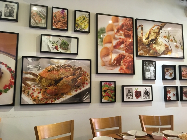 リトルインディアの先の地下鉄 MRT ファーラーパーク (Farrer Park) 駅から徒歩数分にある萬合楼。ちょっと旅行者には探しにくい場所にありますが、タクシーで行けばオーチャードなどのシンガポール中心部から15分ほど。レストランの周りはちょっと寂れた感じの町並みですが、いったん中に入ると清潔感のあるオシャレな雰囲気。壁に大きな額縁に入った写真が貼ってあり、メニューを見る前からお腹がすいてきます。