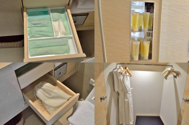 アメニティーは、引出の中にくし、髭剃り、シャワーキャップ、綿棒、歯ブラシ、ボディーローションが揃っています。ドライヤーは、洗面台の引出の中にあります。シャワーブースには、シャンプー、コンディショナー、バスジェルが置いてあります。クローゼットの中にバスローブがあります。