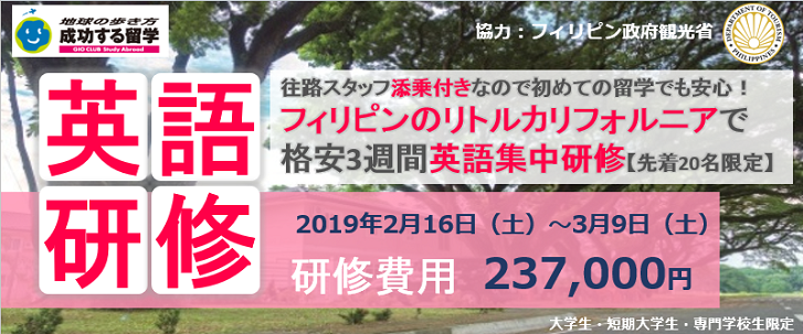 おすすめ【学生20名限定】2019年春休みお得なフィリピン英語短期留学~3週間237,000円(航空券込)~