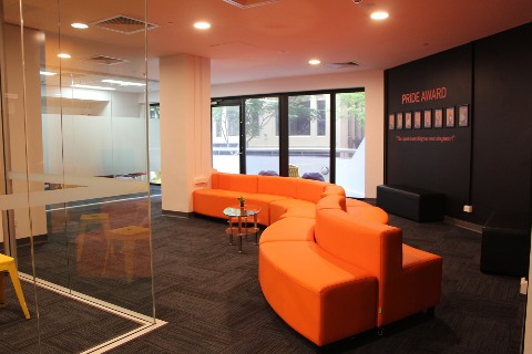 4フロアのとても開放感のあるキャンパスで、ブリズベンの学生は自由に学校の設備を利用できます。まずは一階のグランドフロアーからご紹介!