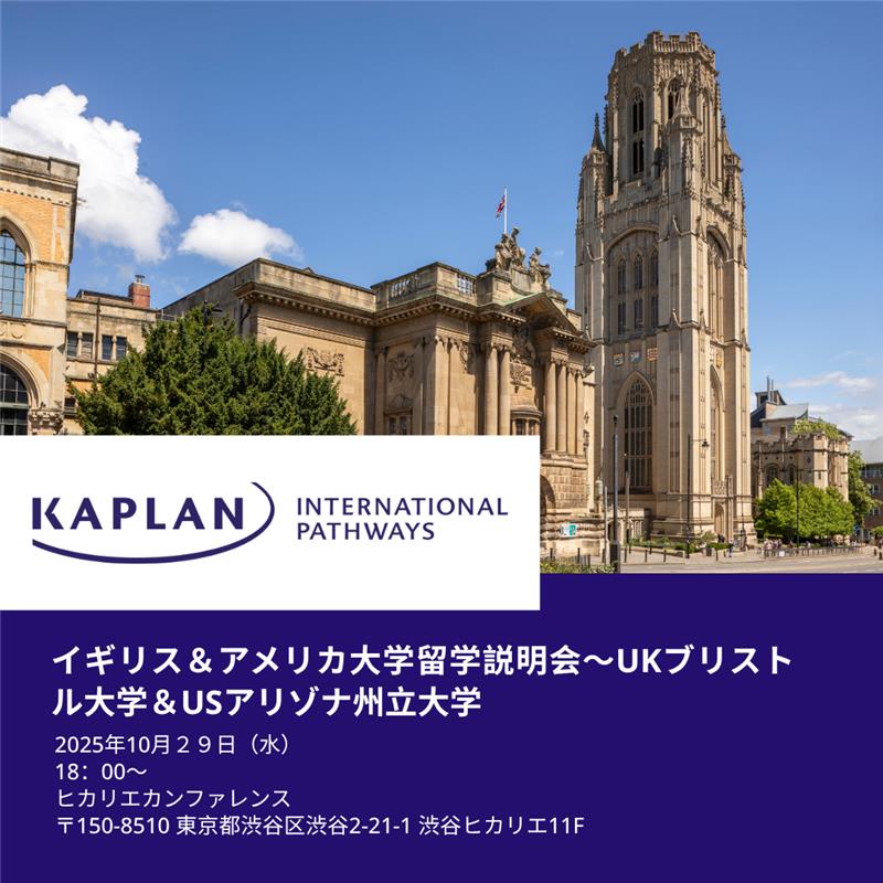 カプラン・インターナショナル・パスウェイズ主催、ブリストル大学(英国)とアリゾナ州立大学(米国)による合同大学説明会が、2025年10月29日(水)に渋谷ヒカリエで開催されます。両大学の現地スタッフに直接質問できるほか、Kaplanの日本担当スタッフ(瀧本・Koey)も来場予定です。公式の詳細・お申込みは以下よりご確認ください。